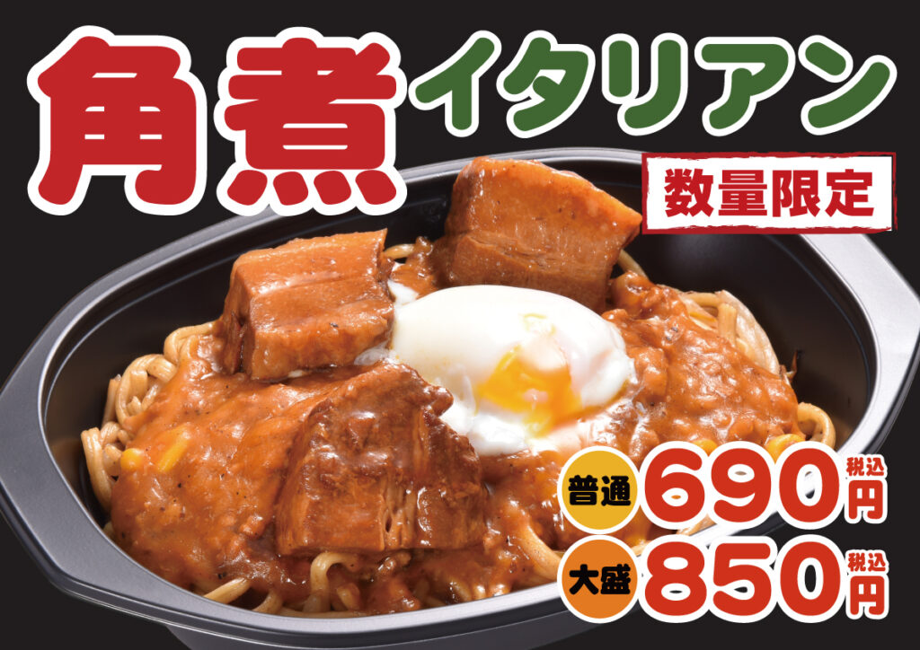 今年も料理長特製の角煮はしっかりと味付けされ、柔らかくジューシーな味わいで、噛むほどに肉の味わいが広がりミートソースとの相性もバッチリ!また半熟たまごを崩してミートソースと混ぜると、ソースのコクがアップしより濃厚な味わいになります。自家製ゴロッと角煮&トロ~リ半熟たまごのボリューム満点コラボレーション みんな大好き「角煮イタリアン」を是非ご賞味ください♪